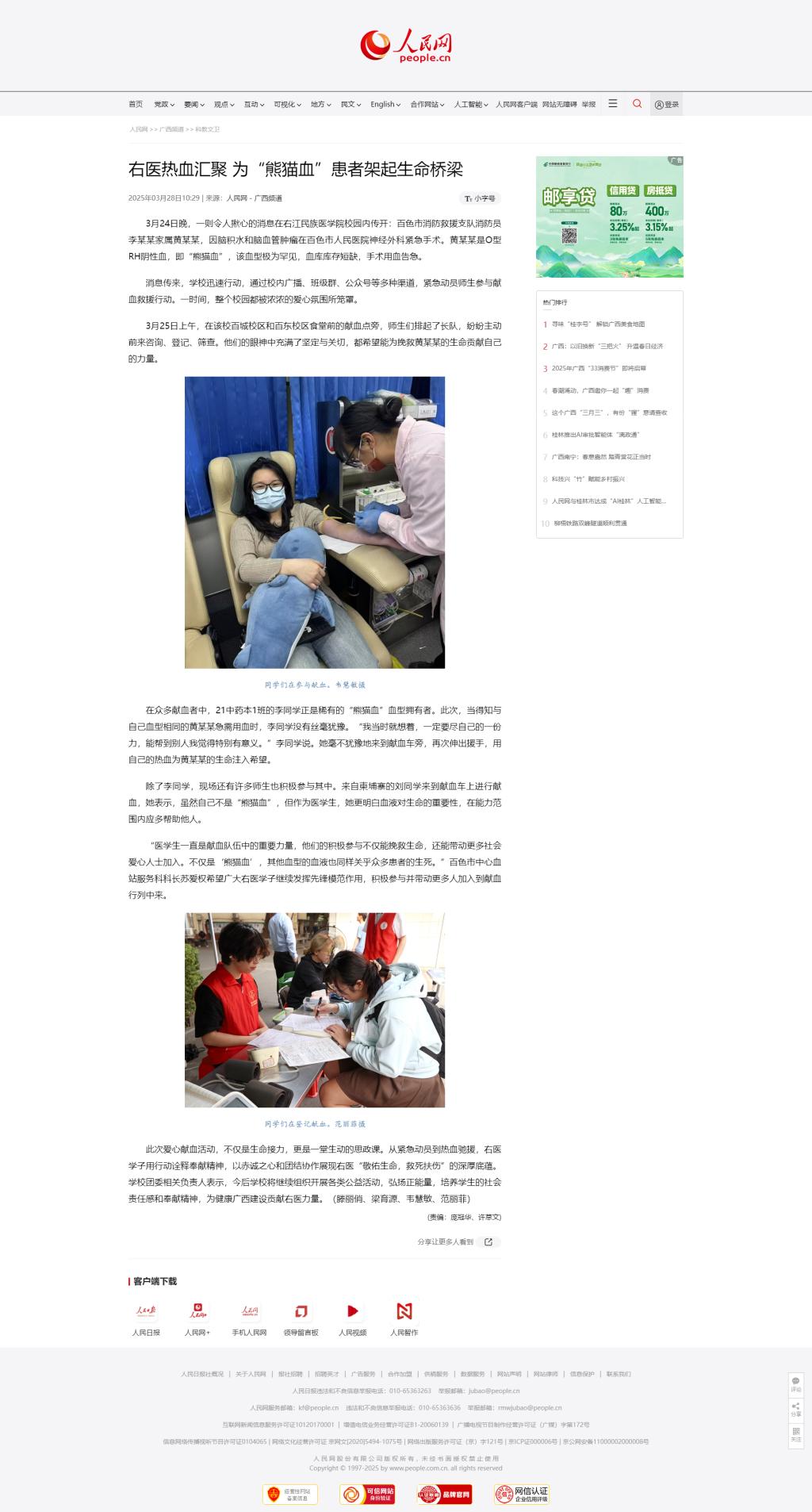 3月28日,人民网以《右医热血汇聚 为“熊猫血”患者架起生命桥梁》为题,报道Beat365官网Beat365官网师生积极为为“熊猫血”患者献血,用爱心架起生命桥梁。