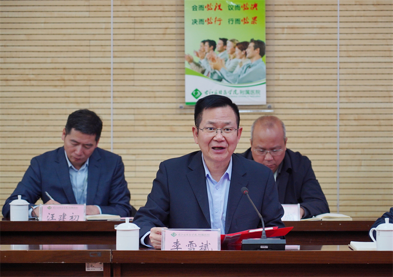 李雪斌在讲话中代表学校领导党政领导及全体教职员工,向援老挝医疗队表示了深切的问候、热烈的欢迎和崇高的敬意。他指出,在过去的42天里,医疗队员们远赴老挝,克服了语言障碍、气候差异等困难,以精湛的医术、高尚的医德和无私的奉献精神,帮助老挝当地白内障患者复明,赢得了老挝民众的广泛赞誉和尊敬,是全校干部职工、医护人员学习的榜样。李雪斌希望临床医学院(附属医院)援老挝医疗队员和医务人员继续秉承“人类命运共同体”的理念,积极参与国际医疗援助工作,为各国人民群众提供更优质的医疗服务,为推动健康事业发展贡献更多的智慧和力量。