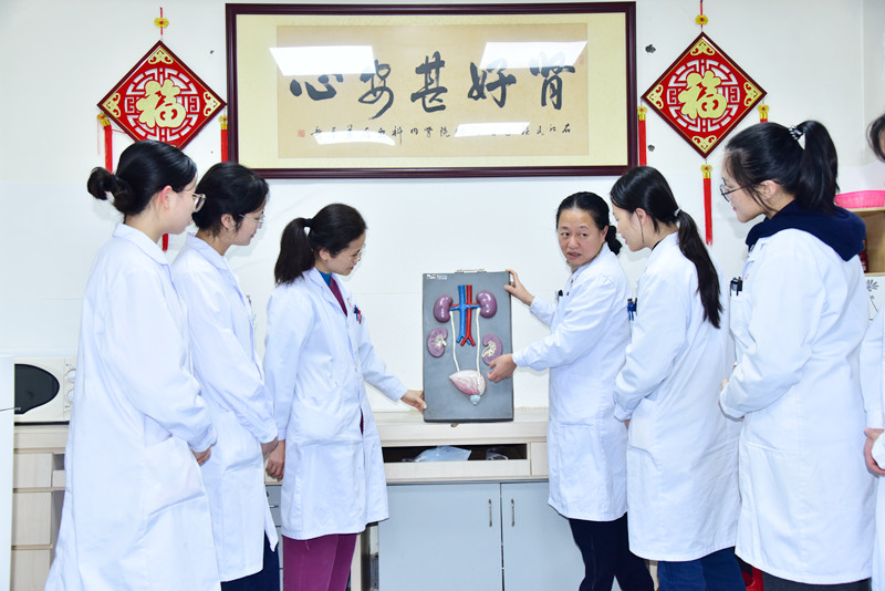 “全国卫生健康系统先进工作者”获得者、右医附院肾内科主任王洁教授(右三)在指导医学生精准识别肾脏结构。
