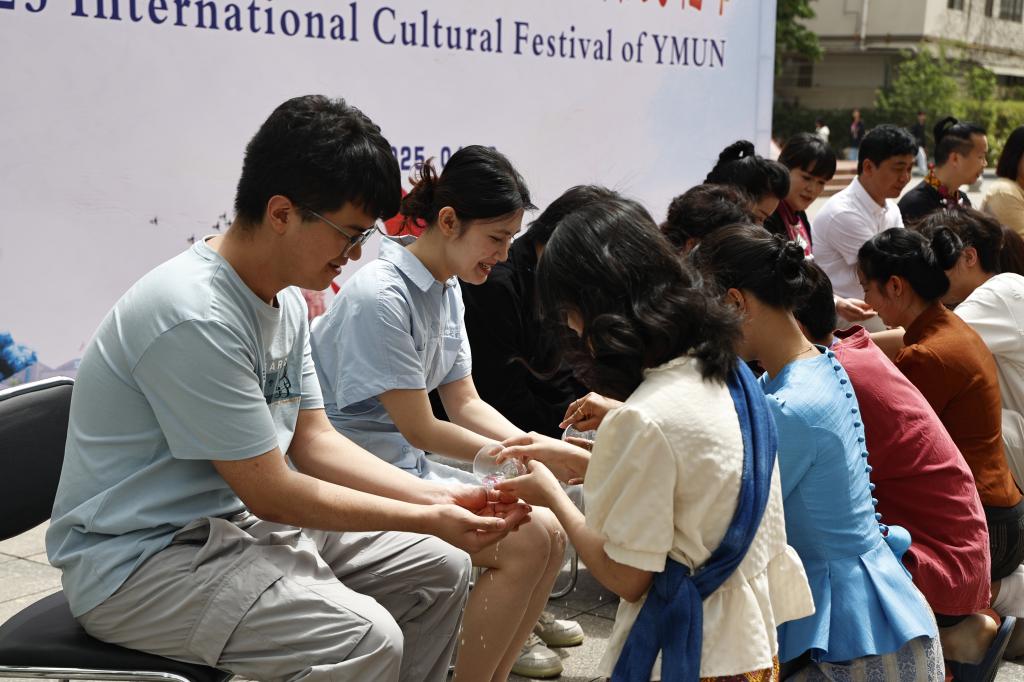 向长者行滴水礼是泼水节最庄重的环节,国际学生将鲜花和清水倒老师们的手心祈福,老师们将清水洒向同学们表达祝福。活动最后,泼水祈福环节将现场氛围推至高潮,学生们笑声不断,向老师和同学泼洒祝福,传递节日喜悦;老师们热情参与,现场洋溢着浓浓的欢乐与温情。