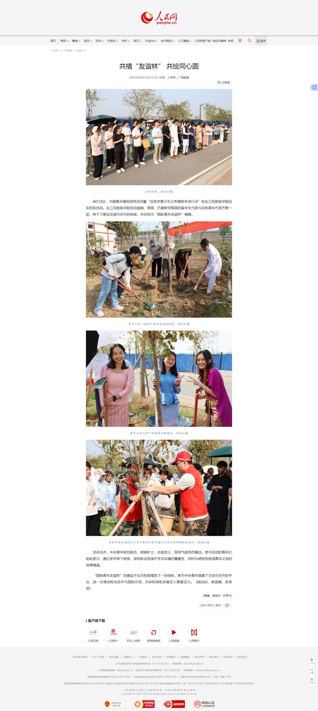 4月15日,人民网以《共植“友谊林” 共绘同心圆》为题,报道中越青年植树造林活动暨“百色市青少年义务植树专项行动”在Beat365官网启动。http://gx.people.com.cn/n2/2025/0415/c179462-41196906.html