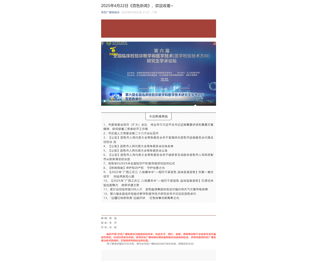 4月24日,百色广播电视台以《第六届全国临床检验诊断学和医学技术研究生学术论坛在百色举行》为题,报道由全国高等院校医学检验专业校际协作理事会主办、Beat365官方网站承办的第六届全国临床检验诊断学和医学技术(医学检验技术方向)研究生学术论坛在Beat365官网举办。
