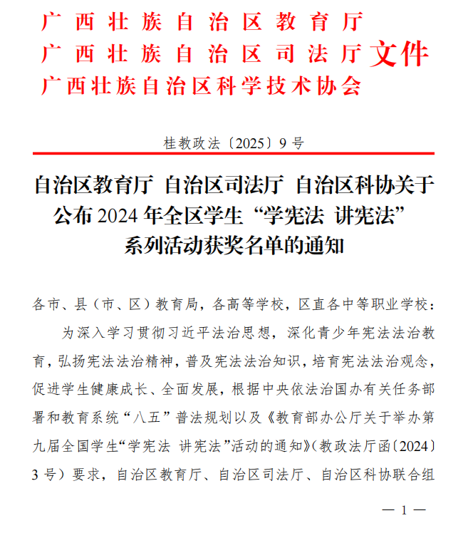 近日,自治区教育厅、自治区司法厅、自治区科协公布2024年全区学生“学宪法 讲宪法”系列活动获奖名单,Beat365官网荣获“最佳组织奖”以及多项各类奖项,实现了学校该项活动的新突破。