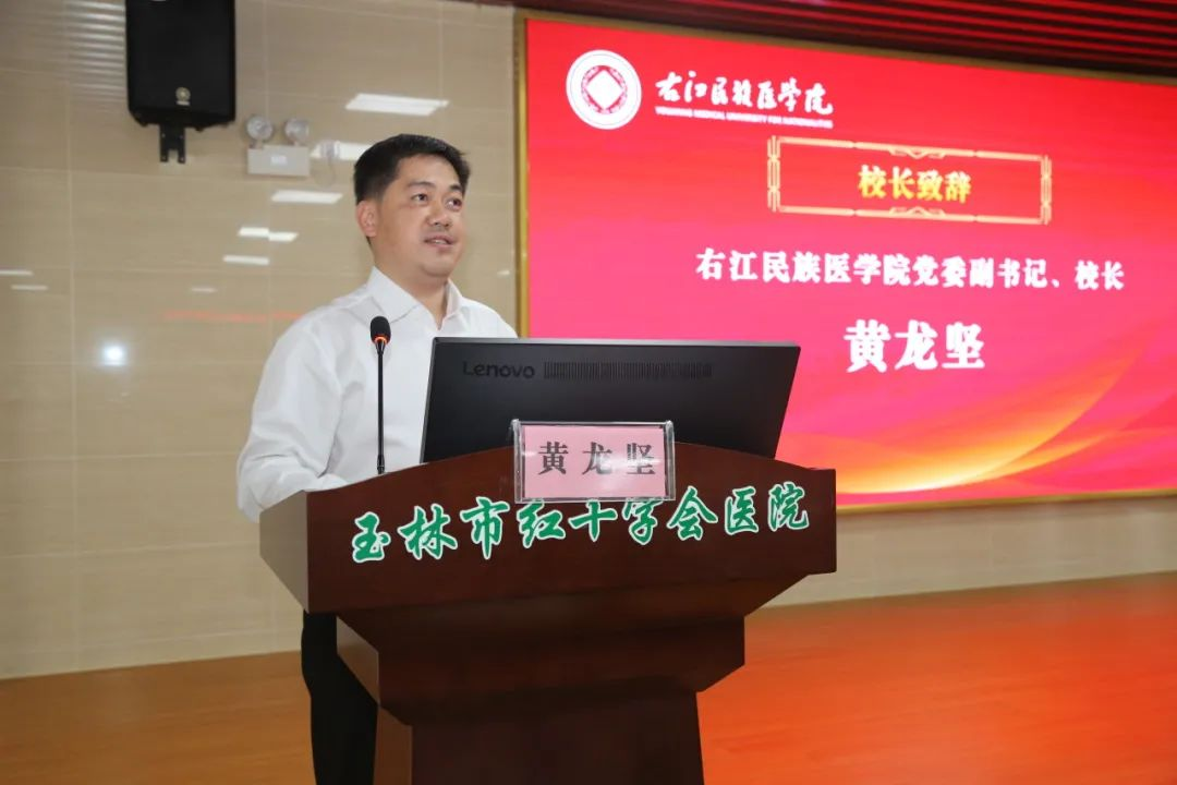 黄龙坚校长代表学校对玉林市政府、市卫生健康委的大力支持及玉林市红十字会医院为玉林校友联络处成立的筹备工作致以崇高的敬意和诚挚的谢意。对于玉林校友联络处的发展,黄龙坚提出三点意见:一是发挥联络职能,凝聚校友力量。期望校友联络处充分发挥桥梁纽带作用,搭建起校友之间、校友与母校之间沟通的桥梁、情感的依托、合作的舞台,成为大家共同的精神家园;二是关心母校发展,为母校在人才培养、学科建设、科研创新、社会服务等工作建言献策,助力母校发展;三是继续传承和弘扬传承“大医精诚”的校训精神,创新求变、开放发展,为民族地区医疗卫生事业高质量发展贡献力量。
