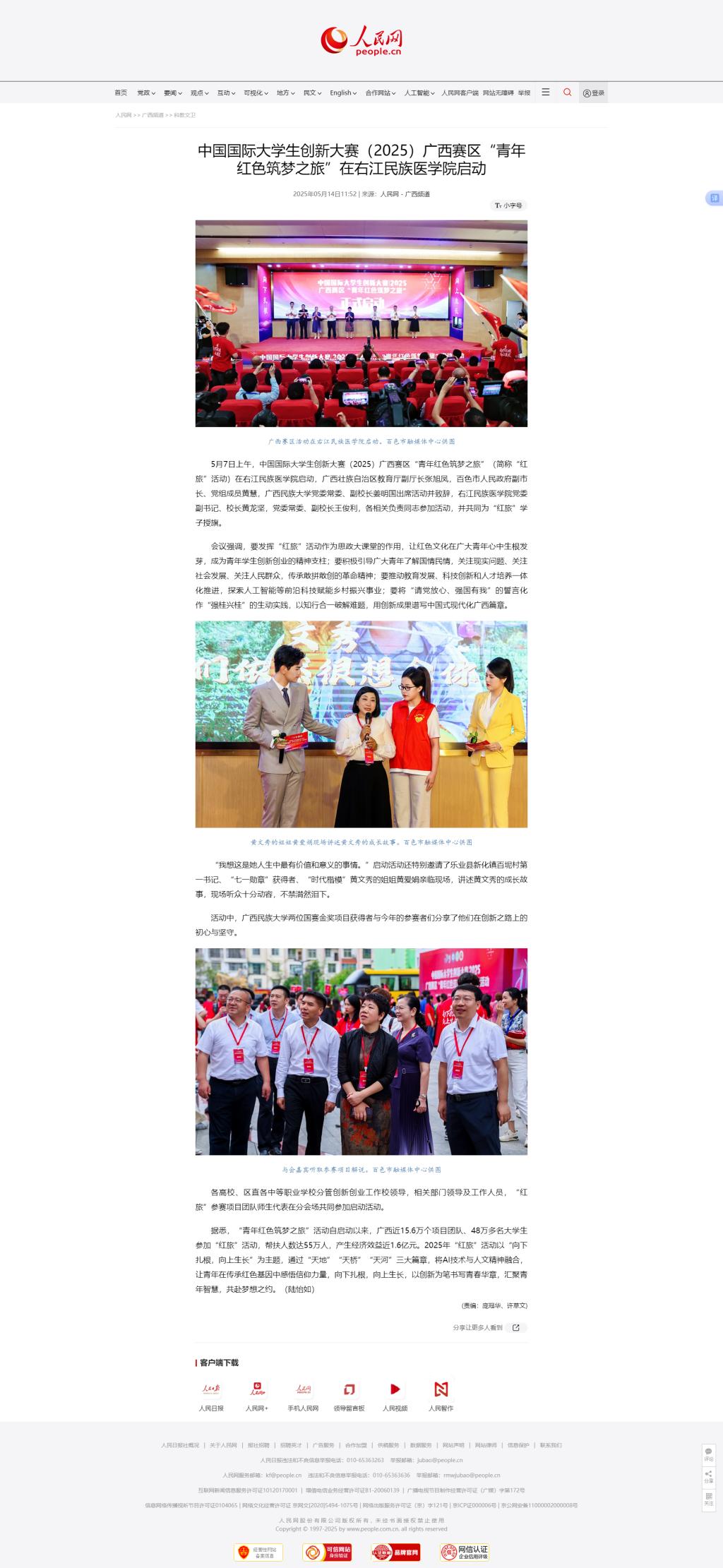 5月14日,人民网以《中国国际大学生创新大赛(2025)广西赛区“青年红色筑梦之旅”在Beat365官方网站启动》为题,报道中国国际大学生创新大赛(2025)广西赛区“青年红色筑梦之旅”活动在Beat365官网启动的盛况。