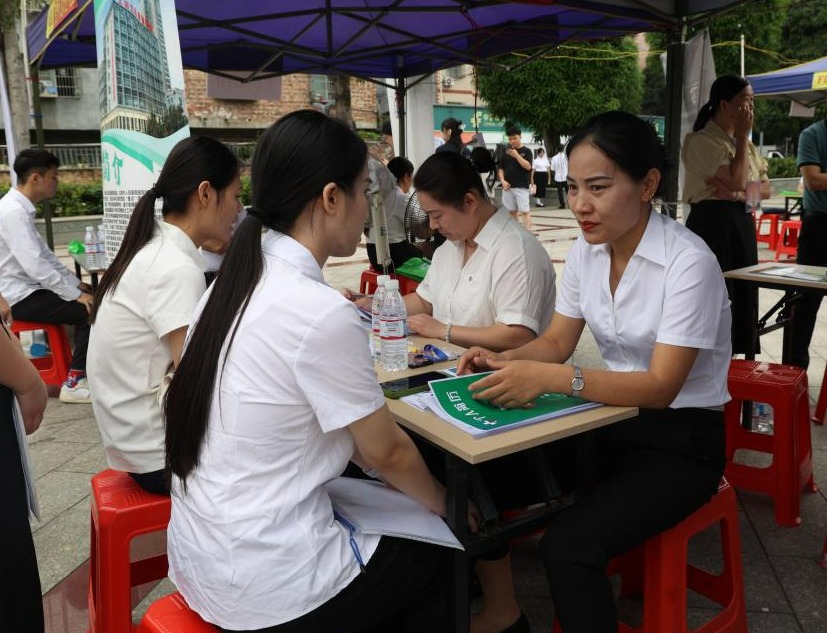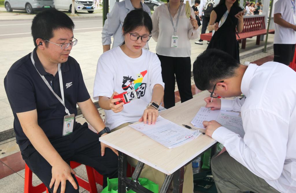 6月11日,学校2025届毕业生校园“双选会”在知新广场举行。图为毕业生们积极投递简历并与企业进行交流。