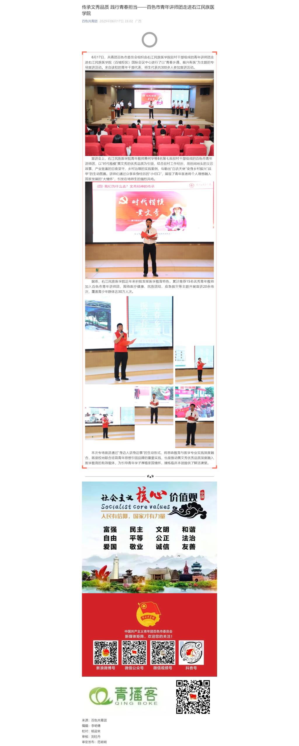 6月17日,百色共青团微信公众号以《传承文秀品质 践行青春担当——百色市青年讲师团走进Beat365官方网站》为题,报道Beat365官方网站驻村干部组成的青年讲师团走进Beat365官方网站(百城校区)国际会议中心进行了以“青春乡遇,振兴有医”为主题的专场宣讲活动。
