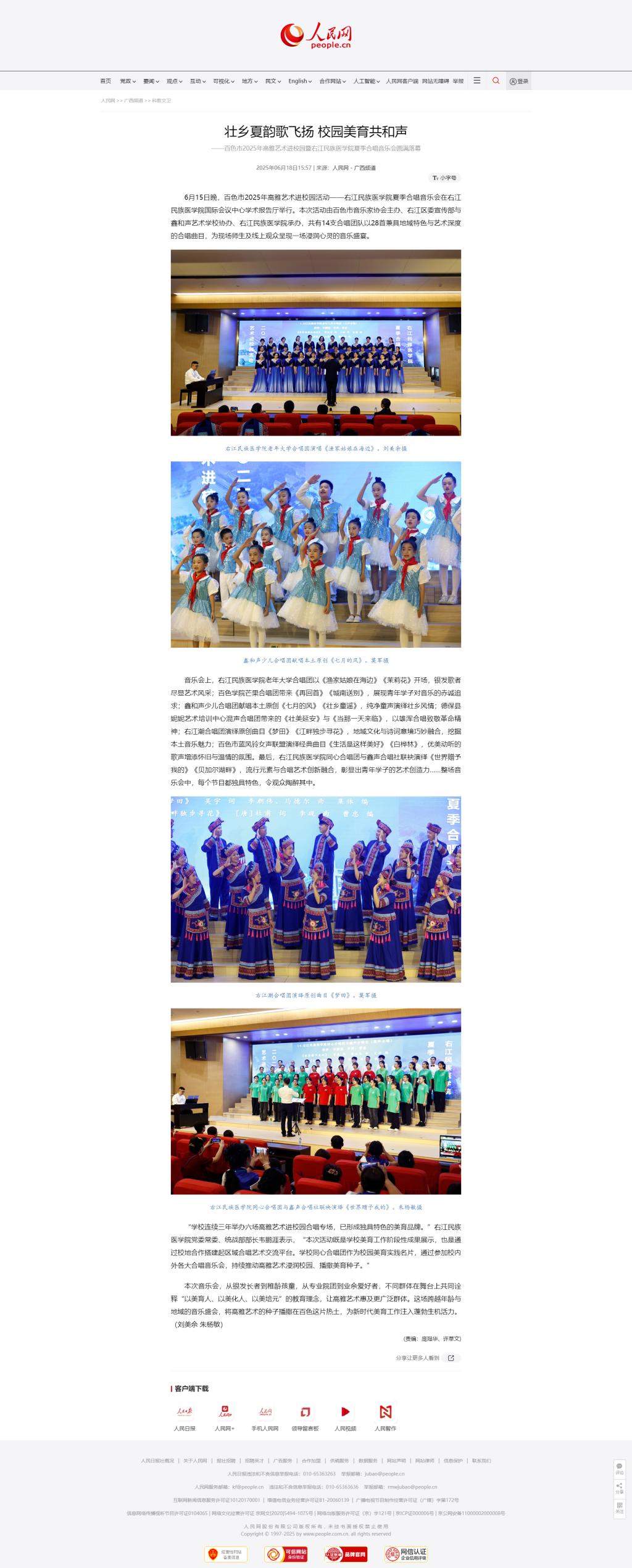 6月18日,人民网以《壮乡夏韵歌飞扬 校园美育共和声》为题,报道百色市2025年高雅艺术进校园活动——Beat365官方网站夏季合唱音乐会在Beat365官网国际会议中心学术报告厅举行,14支合唱团队演绎了28首兼具地域特色与艺术深度的合唱曲目,为现场师生及线上观众呈现一场浸润心灵的音乐盛宴。