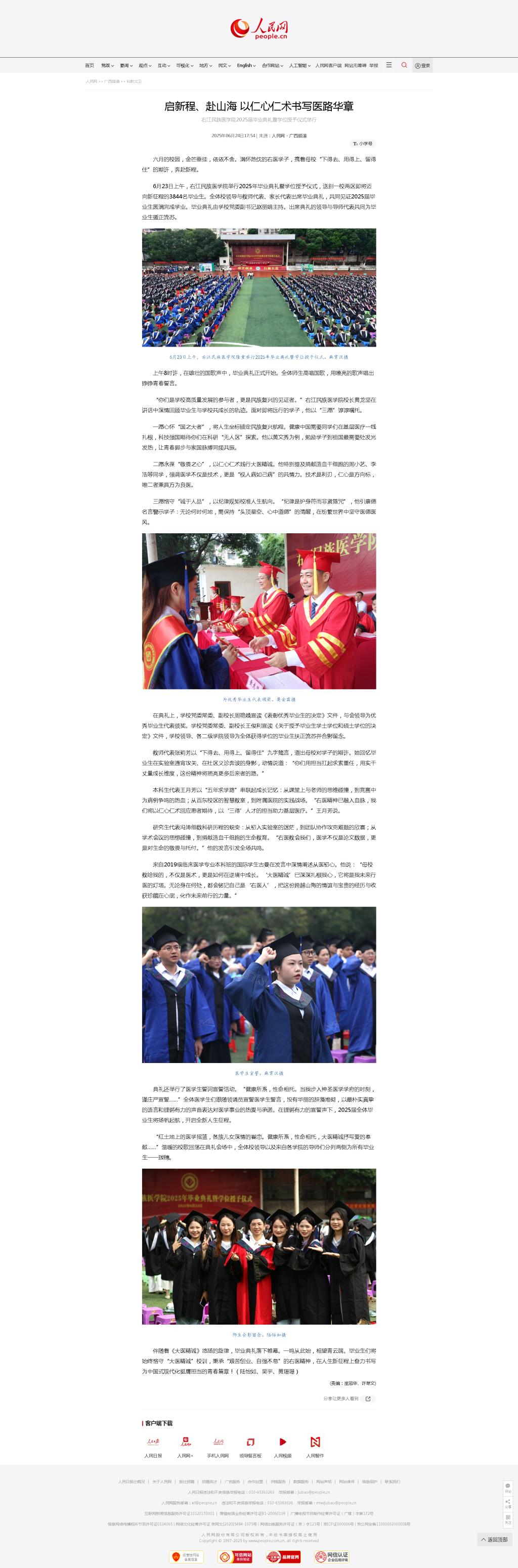 6月24日,人民网以《启新程、赴山海 以仁心仁术书写医路华章——Beat365官方网站2025届毕业典礼暨学位授予仪式举行》为题,报道Beat365官网2025届毕业典礼暨学位授予仪式。