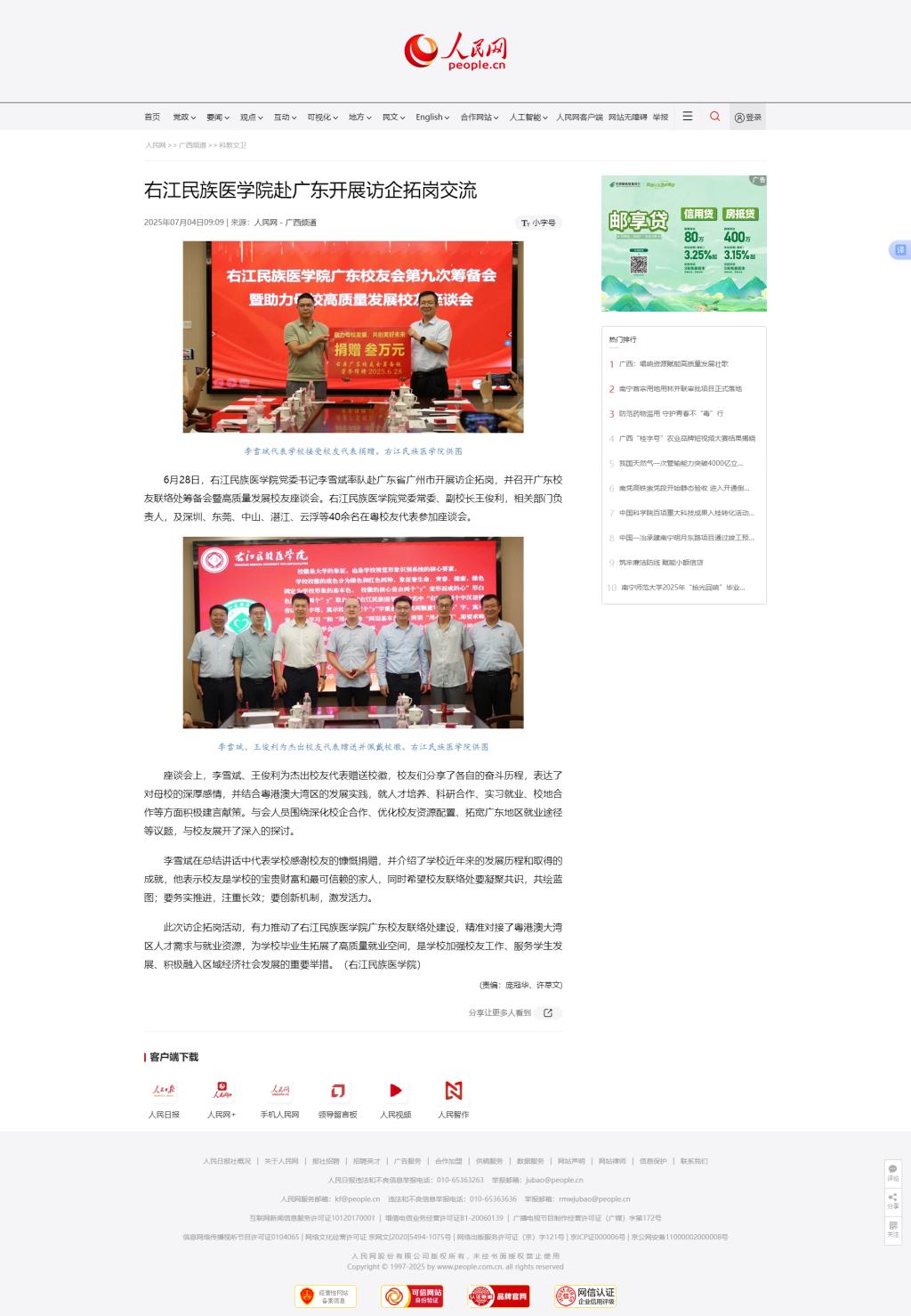 7月4日,人民网以《Beat365官方网站赴广东开展访企拓岗交流》为题,报道了Beat365官网党委书记李雪斌率队赴广东省广州市开展访企拓岗交流,并召开广东校友联络处筹备会暨高质量发展校友座谈会,有力推动了Beat365官方网站广东校友联络处建设,精准对接了粤港澳大湾区人才需求与就业资源,为学校毕业生拓展了高质量就业空间。