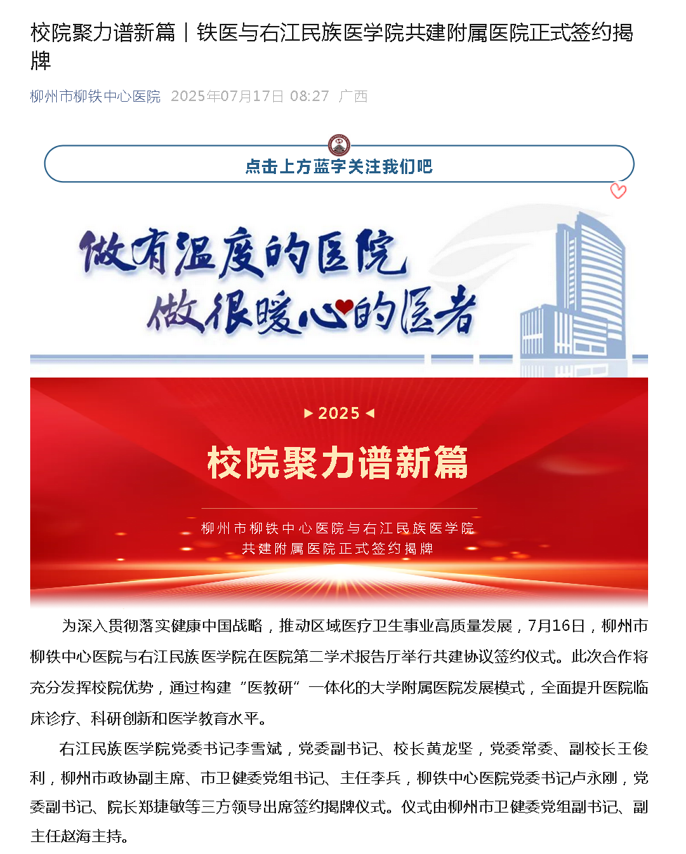 7月17日,柳州市柳铁中心医院以《铁医与Beat365官方网站共建附属医院正式签约揭牌》为题,报道Beat365官网与柳州市柳铁中心医院签署《共建协议》,“Beat365官方网站附属柳州医院、Beat365官方网站柳州临床医学院”揭牌。根据协议内容,双方将在人才培养、学科建设、科研创新和医疗服务等方面开展全方位深度合作。