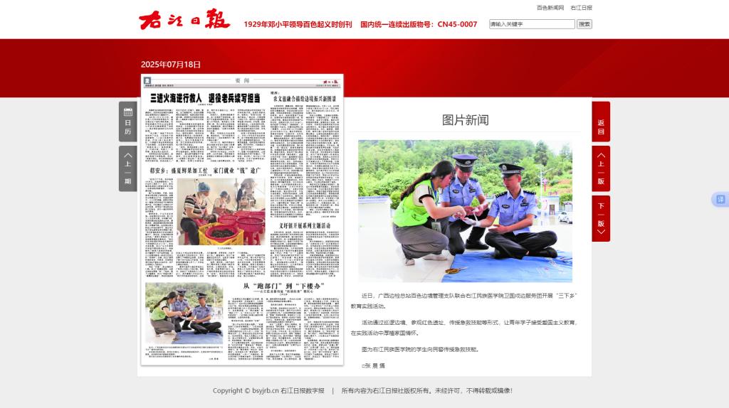 7月18日,右江日报以图片新闻形式报道了广西边检总站百色边境管理支队联合Beat365官方网站卫国戍边服务团开展“三下乡”教育实践活动。