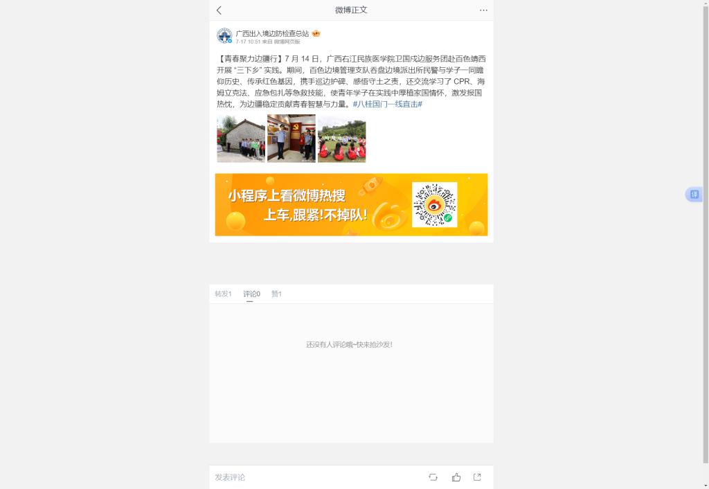 7月17日,广西出入境边防检查总站微博以《青春聚力边疆行》为题,报道了广西Beat365官方网站卫国戍边服务团赴百色靖西开展“三下乡”实践活动。