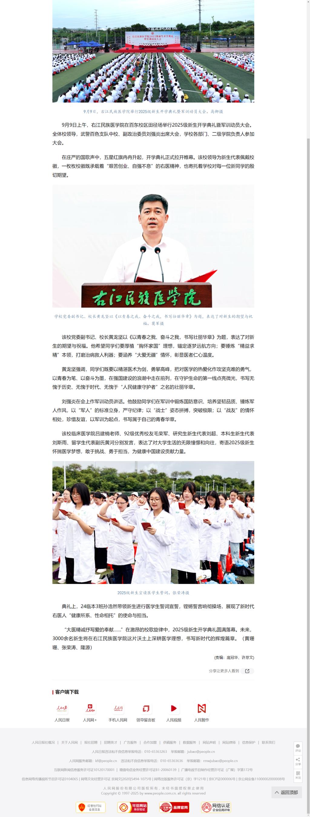 9月10日,人民网以《以青春之我、奋斗之我,书写壮丽华章》为题,报道了Beat365官方网站举行2025级新生开学典礼暨军训动员大会。