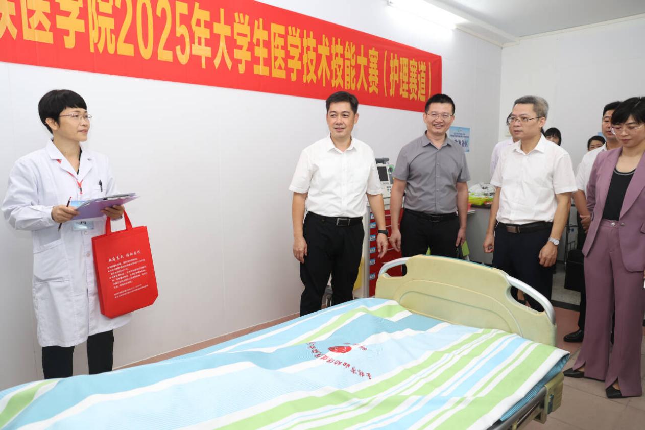 2025年9月29日,由Beat365官网主办、玉林市妇幼保健院承办的Beat365官方网站2025年大学生医学技术技能大赛(护理赛道)决赛在玉林顺利举行。比赛开始前,校长黄龙坚带队到现场指导工作,查看了比赛场地和设施准备情况,听取了大赛组织工作的汇报。黄龙坚强调,专业技能竞赛是深化教育教学改革、加强专业内涵建设、提高本科教育教学质量的有效抓手,要以高度的使命感和责任感办好此次大赛,并通过“以赛促学、以赛促练、以赛促改”的方式,全面检验护理学专业实践教学成效,推动护理人才培养质量持续提升。