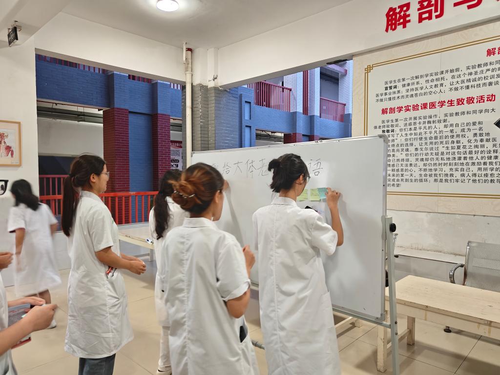 最后,学生们以一种庄重而温暖的方式向“大体老师”表达了自己的敬意与感恩。活动现场,学生们纷纷将自己想对“大体老师”说的话写在纸上,然后小心翼翼地贴在相应的位置,每一句话都充满了对“大体老师”的敬意与感激。学生们在寄语中写道:“亲爱的‘大体老师’,您用自己最后的奉献,为我们点亮了医学之路。您的身体是我们学习的课堂,您的精神是我们前行的动力。我们会铭记您的付出,努力成为一名优秀的医学生,不辜负您的期望。”“‘大体老师’,您虽然无法言语,但您的奉献却胜过千言万语。我们会珍惜每一次学习的机会,用心去感受您的教诲,用行动去践行医者的使命。”