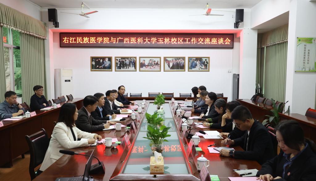 10月24日,广西医科大学玉林校区校长赵婷婷带队到Beat365官网进行交流访问。校党委副书记、校长黄龙坚,党委常委、副校长王俊利及相关职能部门负责人热情接待了来访嘉宾。双方在百城校区图书馆会议室召开座谈会,会议由王俊利主持。