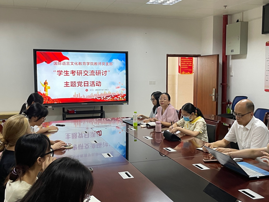 为推动学习贯彻习近平新时代中国特色社会主义思想主题教育走深走实,落实“为民解忧办实事”相关要求,6月30日下午,国际语言文化教育学院教师党支部开展“学生考研交流研讨”主题党日活动。本次活动由教师党支部书记李金艳主持,学院副院长李培隆、教师党支部和学生党支部党员、专业课教师,以及有意向考研的学生参加本次活动。