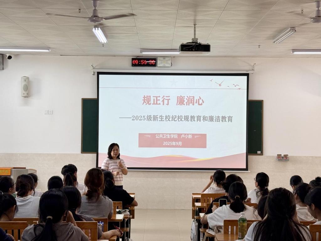 为进一步帮助新生养成遵规守纪的行为规范,筑牢学生思想防线,扣好人生“第一粒扣子”,9月13日,公共卫生学院在守正楼开展了以“规正行 廉润心”为主题的2025级新生校纪校规教育和廉洁教育。本次教育活动由公共卫生学院党委副书记、纪委书记卢小新授课。