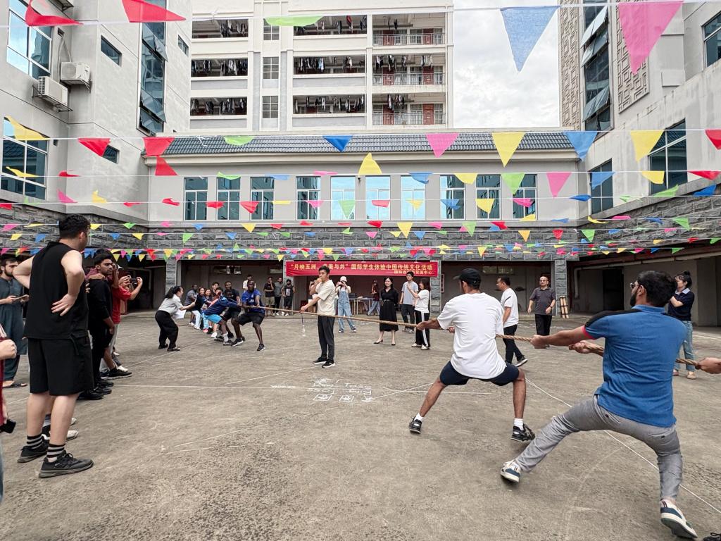 游园会现场设置了六项趣味盎然的传统游戏,均以中秋元素命名,如“喜鹊搭桥”(拔河比赛)、“嫦娥奔月”(板鞋比赛)、“九天揽月”(背夹球比赛)、“探月工程”(抛绣球比赛)、“桂子逐月”(毽球比赛)以及“众星捧月”(快乐套圈)。国际学生们热情投入各项活动,加油声、欢笑声、掌声不绝于耳。无论胜负,每位参与者的脸上都绽放出灿烂笑容,眼神如当空皓月般明亮闪耀。活动不仅拉近了彼此之间的距离,也为校园增添了一抹灵动多元的文化色彩。