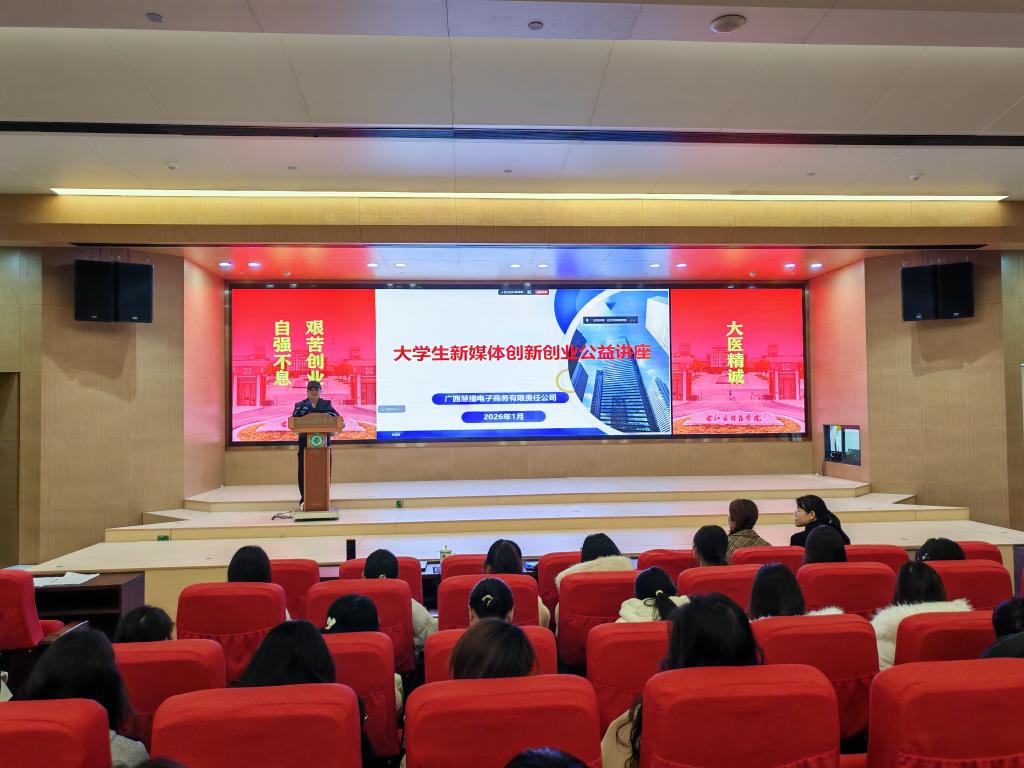 1月8日晚,人文与管理学院特邀广西慧播电子商务有限责任公司法人代表兼总经理方梅坚、运营总监陈云峰、慧播商学院副院长潘国欢在百城校区国际会议中心学术报告厅给学院师生作大学生新媒体创新创业专题讲座。人文与管理学院党委副书记陶肖云出席本次讲座,全院300多名师生到场聆听。