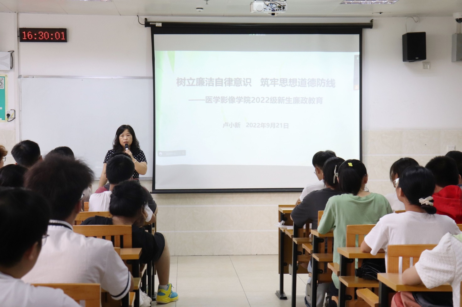 为积极响应学校组织开展的“清廉学校文化建设月”活动,帮助新生树立廉洁自律意识,筑牢思想道德防线,让大学生知廉洁、懂廉洁、要廉洁,形成廉洁修身的风尚,9月21日下午,医学影像学院在大学生中开展了廉洁教育专题党课。本次课由医学影像学院纪委委员卢小新老师主讲,学院全体新生班干参与。