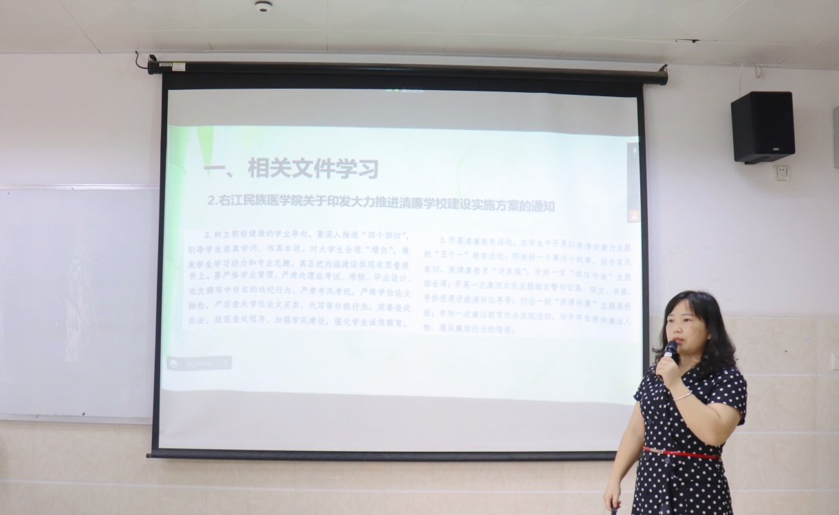 会议伊始,卢小新老师首先与同学们学习了桂发【2022】2号文、右医党委【2022】17号文和影像党委【2022】2号文三份与清廉学校建设相关的文件,把文件中提到的在大学生中开展“五个一”清廉教育活动进行详细解读,并号召同学们积极参加其中。接着,卢老师指出了大学生中廉洁和不廉洁的表现,并向同学们提出了四点希望,一是要养正气练内功,加强思想道德建设;二是加强宣传教育,倡导廉洁自律;三是践行廉洁诚信理念,规范自身言行;四是坚守学术诚信,严肃学风纪律。