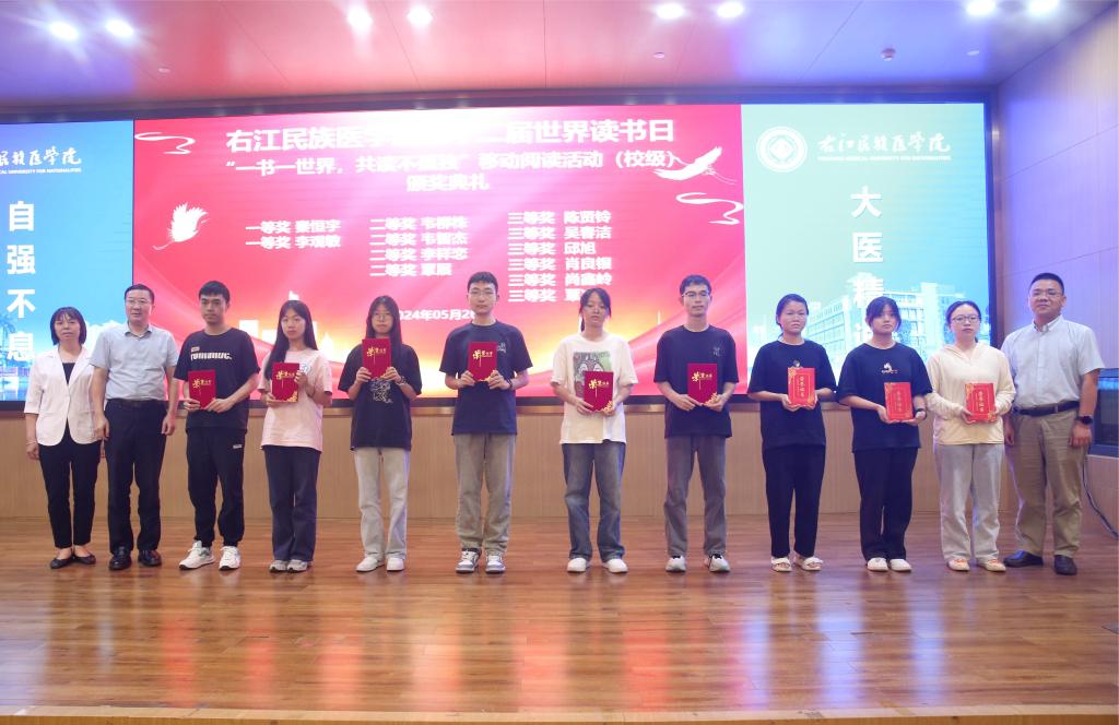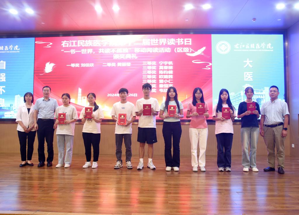 与会领导为“一书一世界,阅读不孤独”移动阅读活动校级获奖选手颁奖。