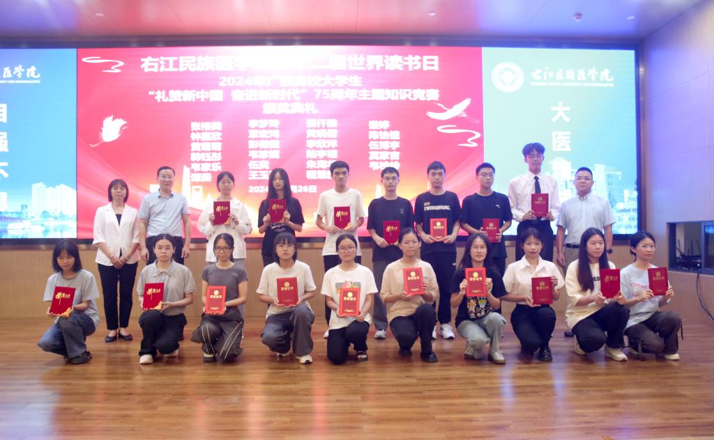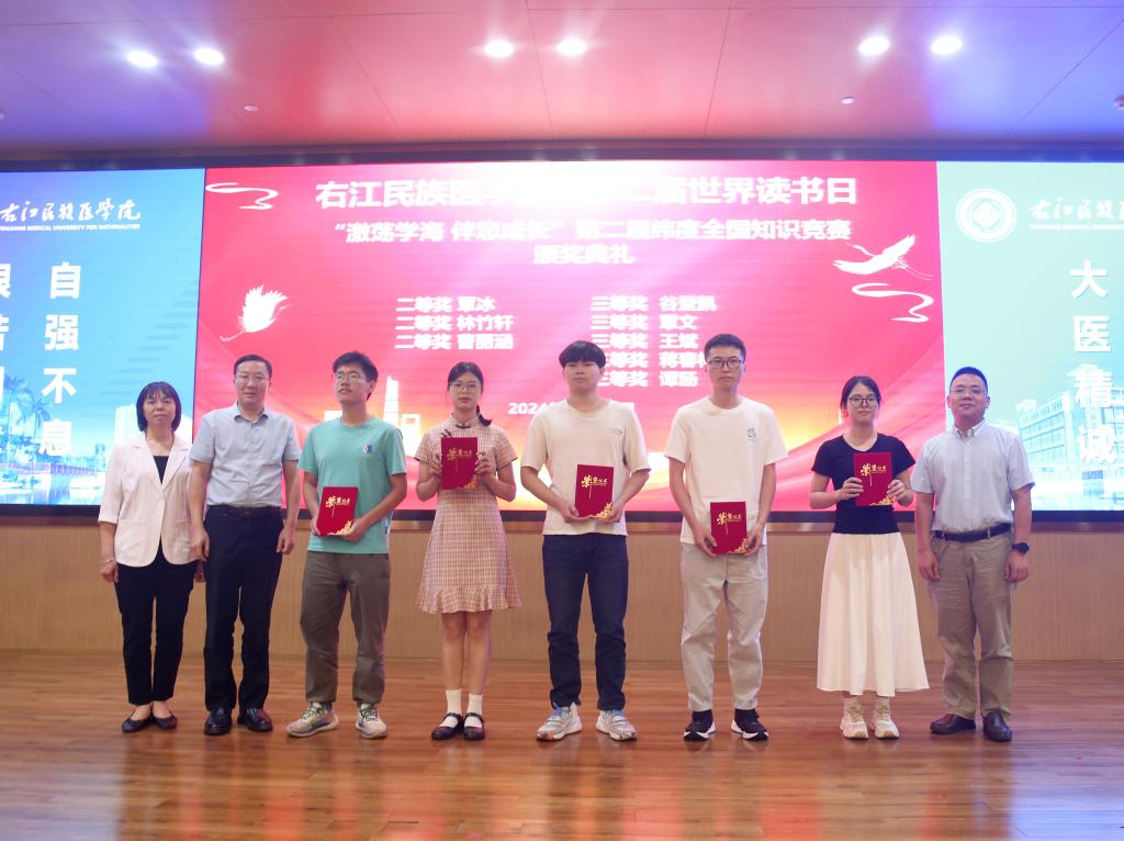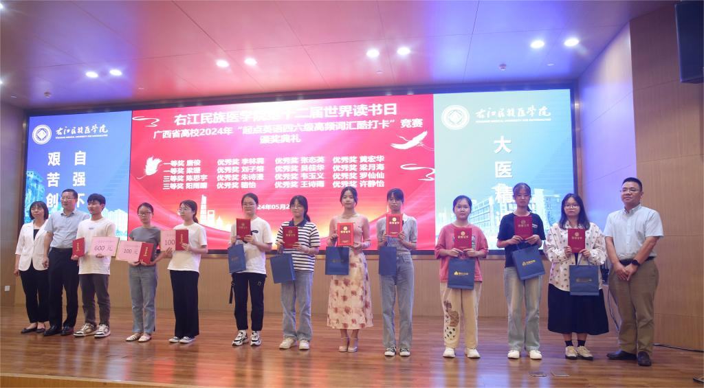 与会领导为广西高校2024年“起点英语四六级高频词汇酷打卡”竞赛区级获奖选手颁奖。