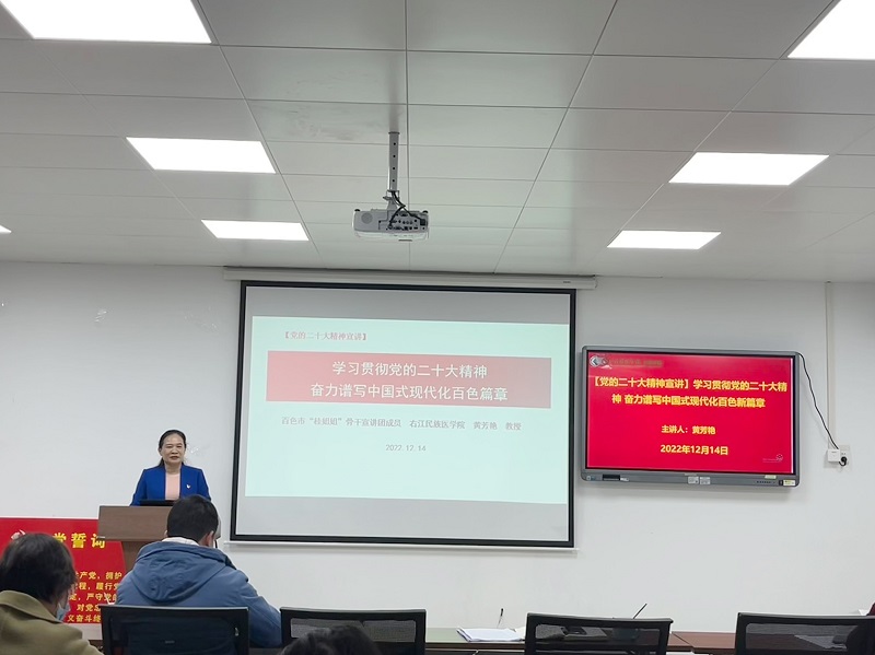 为深入学习宣传贯彻党的二十大精神,引导广大党员同志及干部职工以习近平新时代中国特色社会主义思想铸魂育人,深刻领悟“两个确立”的决定性意义,增强“四个意识”、坚定“四个自信”、做到“两个维护”,自觉把思想和行动统一到党的二十大精神上来,12月13、14日下午 ,护理学院教师党支部、护理学院分别开展“桂姐姐”党的二十大精神专题宣讲,由百色市“桂姐姐”宣讲团骨干成员、Beat365官方网站护理学院党委书记黄芳艳教授主讲。