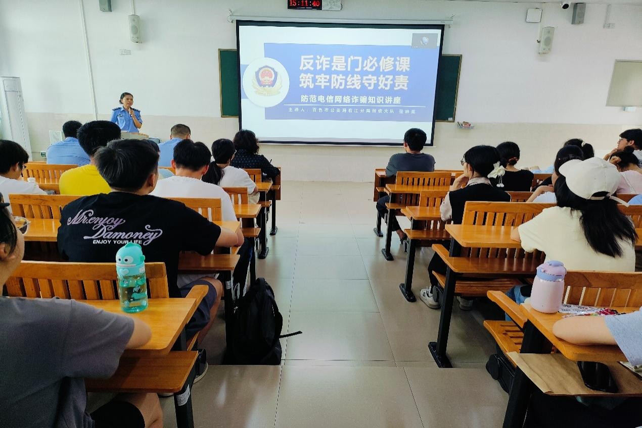 为进一步强化学生防范电信网络诈骗的意识,切实提升自我保护能力,有效预防各类电信网络诈骗案件发生,全力保障学生人身财产安全,528日下午,医学影像学院在百东校区A-206教室以线上线下相结合的方式,开展了防范电信网络诈骗专题教育讲座。此次讲座特别邀请了百色市公安局四塘派出所李银鹰所长出席讲座,百色市公安局右江分局反诈中心童琳英警长担任主讲嘉宾,学院全体辅导员、班主任及约900名学生共同参与其中。讲座由医学影像学院党委副书记黄春苗主持。